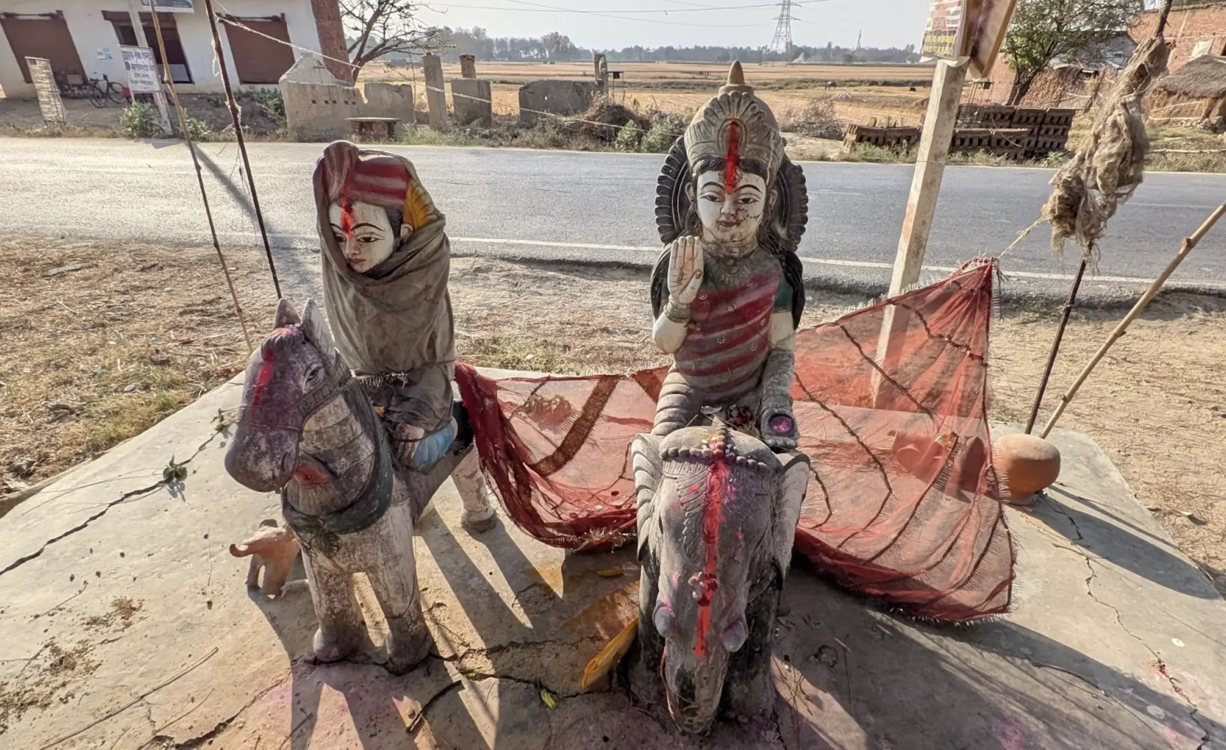 A few hundred kilometers east of Trilokpur, two villages are in competition over their name. One calls itself Isaru, the other Esharou, both pronounce the name the same. Perhaps a family conflict lies in their past, maybe a case of splintered claims and ownership. But at the main highway that splits these two villages is a humble installation. Most who pass by would not even notice it. Two figures draped in old, soiled fabric, seated facing the village on their mounts. Here, Deuhare Baba is called Dih Baba, and alongside him is his consort. They are the guardian deities of the village. And even as Isaru and Esharou compete over their name, inhabitants of both villages pause here and take a moment of gratitude and prayer, whenever they pass by.
