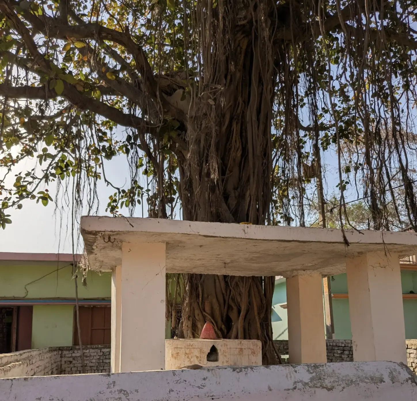 A few hundred meters into the village, another innocuous shrine comes into view. Cows idle lazily here, turning their curious eyes to the rare visitors that venture. A dog sits in the shade of a large bull, its ears keen to the surroundings. Under an old banyan tree, a small shrine marks the region of Sati mā, my kula devī. She is mostly forgotten now, and the neglect around her shrine reflects it. We are led here by a cousin, but even he has an amused smile on his face as he guides us. As if to say - why are you folks so curious about her?