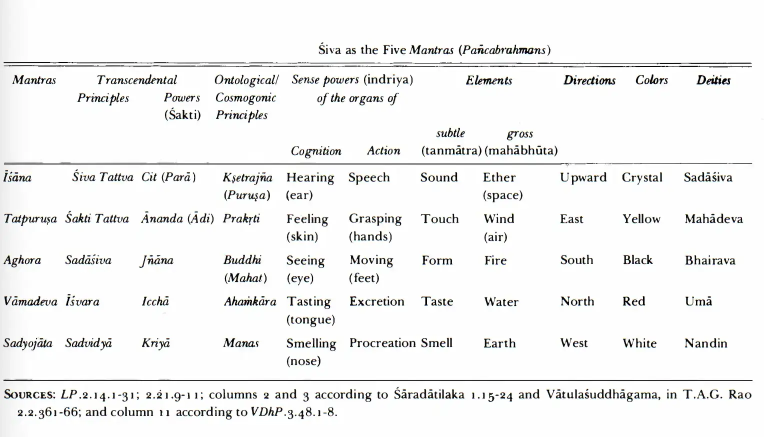 pañcabrahmans—Sadyojāta, Vāmadeva, Aghora, Tatpuruṣa, and Īśāna. Each is associated with a direction, a mantra, an element, a sense, and an organ of perception or action. The