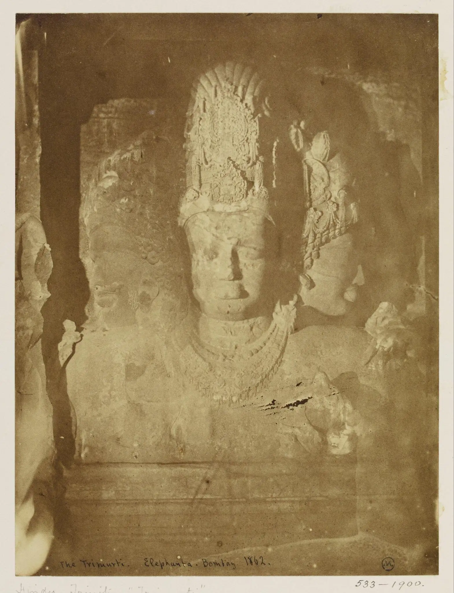 Trimurti sculpture at Elephanta, Bombay, dated 1862. William Simpson